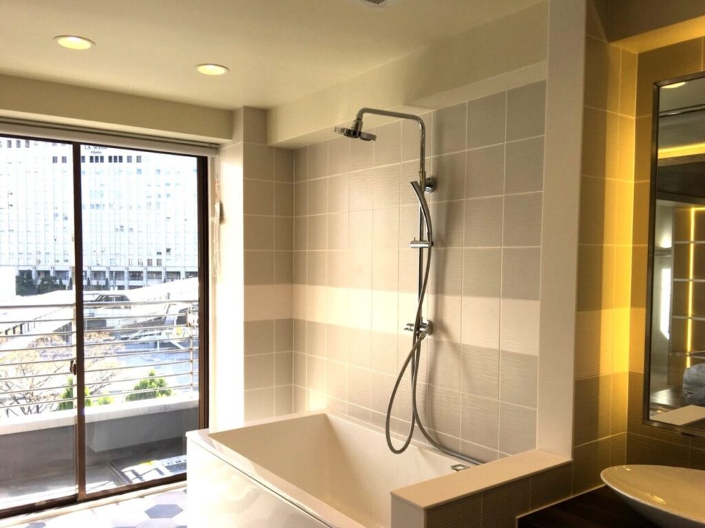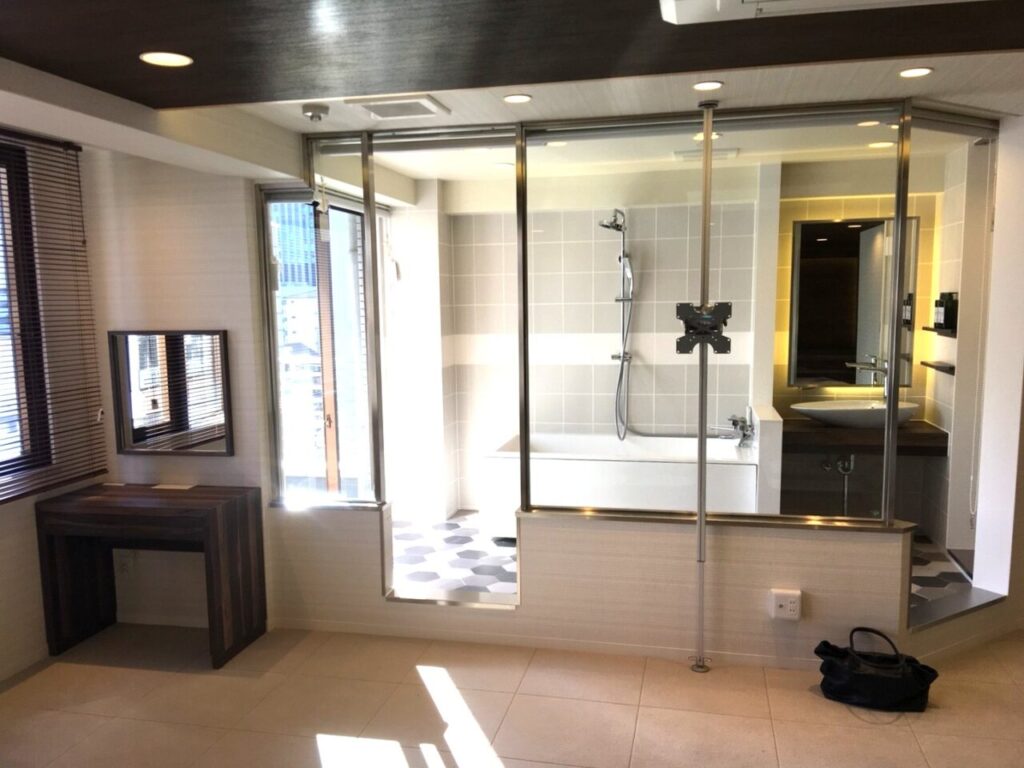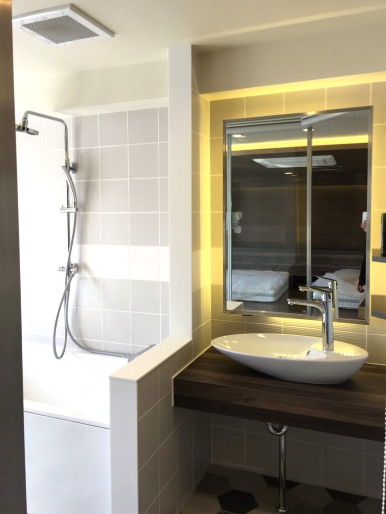 シャワーと洗面スペースが一体となった空間。
